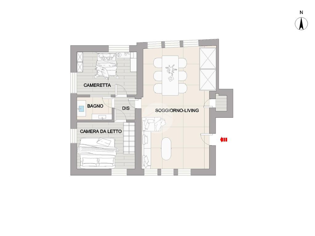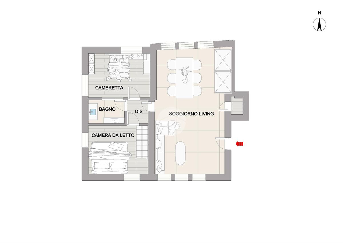 Internamente è così composto: ingresso in ampio soggiorno-living, camera da letto, cameretta, bagno e ripostiglio.